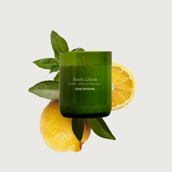 La bougie parfumée “Basilic Citron” invite l’esprit des jardins méditerranéens dans votre intérieur : basilic, citron, jasmin, musc se mêlent pour créer un sillage frais, végétal et lumineux. Présentée dans un contenant en verre recyclé, issu d’une véritable bouteille, chaque bougie incarne l’upcycling et l’artisanat de QDB Editions. À la première flamme, elle diffuse une ambiance estivale, vivante et délicate, parfaite pour vos soirées, pauses ou moments de détente.