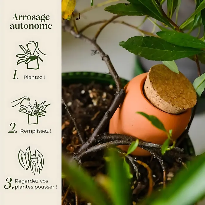 Pour les vacances, arrosez la surface et remplissez l’olla avant de partir, elle servira de réservoir d’eau supplémentaire.