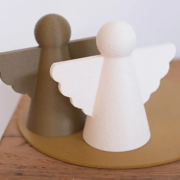 Imprimé en 3D à Roubaix à partir de PLA biosourcé, cet ange est le reflet de notre démarche éthique et locale. Léger et résistant, il peut être déplacé facilement pour personnaliser différents coins de votre maison.