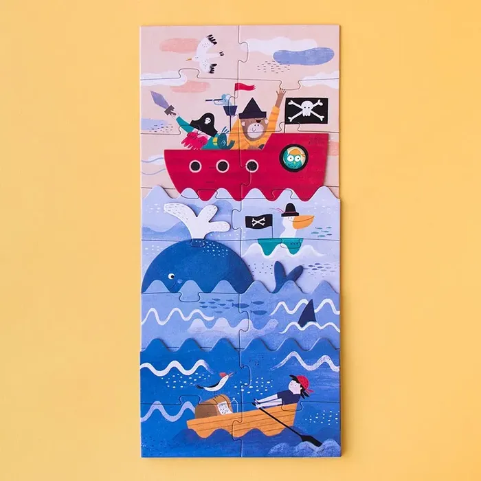 Ce puzzle unique se compose de 4 scènes superposées, chacune formée d’un nombre croissant de pièces : 4, 8, 12 et 16 pièces. En les assemblant du plus grand au plus petit, l’enfant révèle progressivement toute l’histoire, du message laissé par la sirène jusqu’au trésor caché.