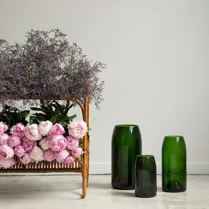 La teinte « Verte 02 » est propre à ces bouteilles, plus sombre et plus profonde grâce à l’épaisseur du verre. Cette couleur élégante se marie parfaitement avec des fleurs blanches ou des compositions audacieuses, apportant une touche de luxe discret à votre décoration.